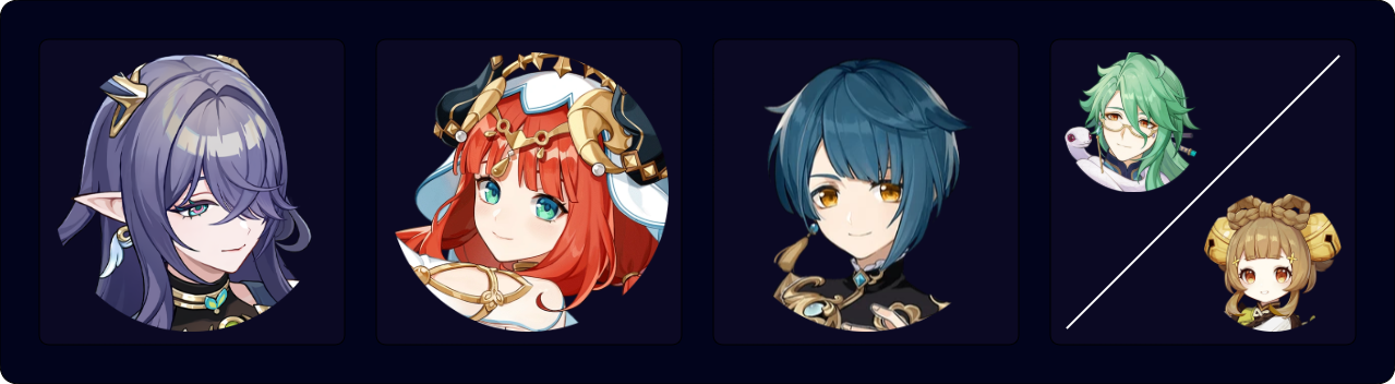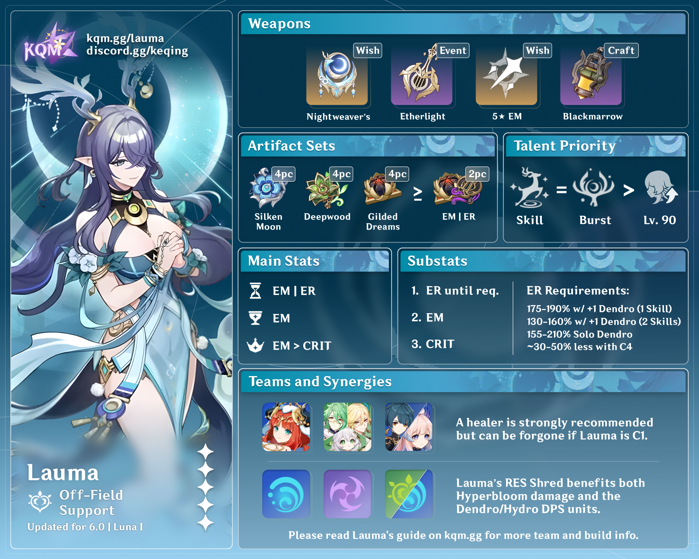 Nahida | Nahida provides good off-field Dendro application and an EM buff to the active character through her Elemental Burst. Nahida’s C2 also allows Bloom reactions to crit; however, only the CRIT Rate buff stacks with Lauma’s A1 Passive. Additionally, she increases Lauma’s Lunar-Bloom CRIT Rate and CRIT DMG. |