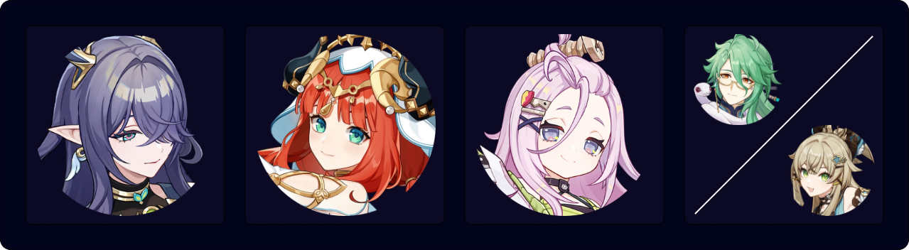 Bloom is one of Lauma’s main teams. Consistent Hydro and Dendro application is crucial to constantly deal Bloom damage. A second Dendro character enables Dendro Resonance to provide additional EM to all party members, and additional Dendro application is important for Dendro Core generation. Some form of sustain should be allocated in order to offset Bloom’s self-damage. Alternatively, Lauma’s C1 can take care of this issue.