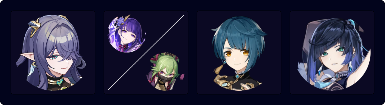 Lauma hE¹ > Xingqiu Q N1 > Raiden E N1 > Yelan E N1 Q N1 > Xingqiu ED N2 > Lauma N1 Q hE 2[N3] > Yelan (N2)² E > Lauma 3[N3]
